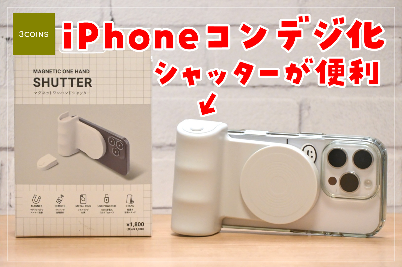 3COINS(スリーコインズ)で、片手で簡単にシャッターが押せる充電式のワンハンドシャッターを買ってきました。MagSafe対応で簡単にスマホに取り付けられますし、縦置きの簡易スマホスタンドにもなって便利なアイテムです。