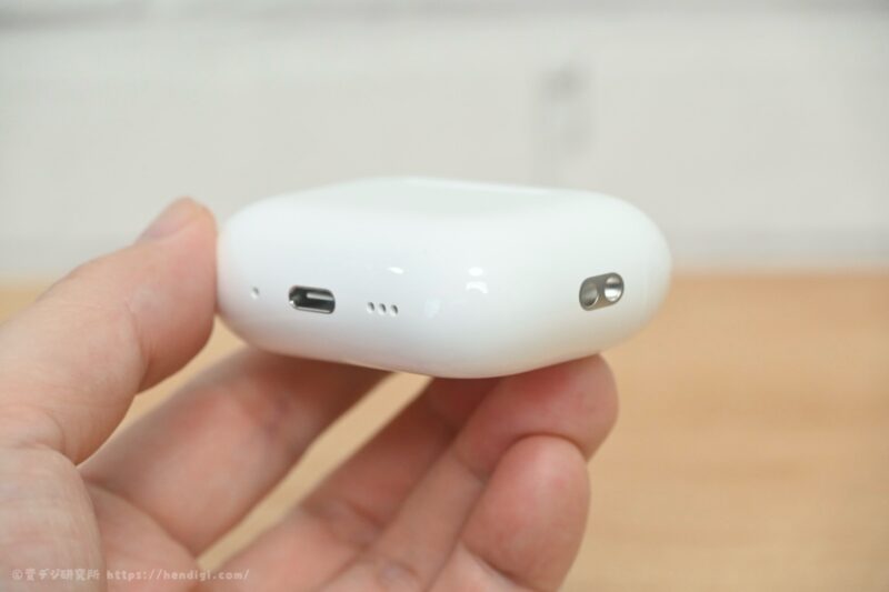 充電端子はUSB-C、これまでと同じようにスピーカー内蔵、ストラップホールもあります。第二世代と違うのはペアリングボタンがなくなったことです。iPhoneのペアリングであれば、ケースの蓋を開けてiPhoneに近づけ、画面の指示に従うだけで完了するので問題ないです。
