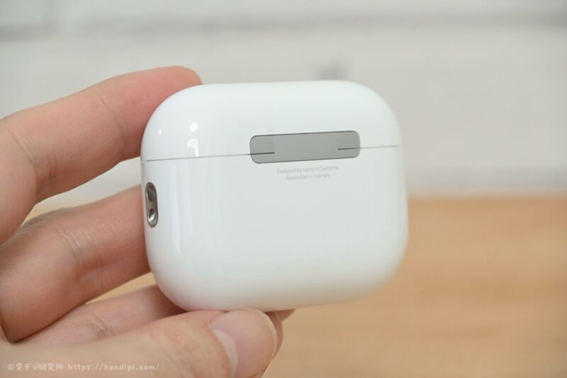 まず、AirPods Pro 3のケースの方が少し大きくなっています。また、正面のLEDも第三世代では内部に埋め込まれていて、ツルッとした見た目になっています。