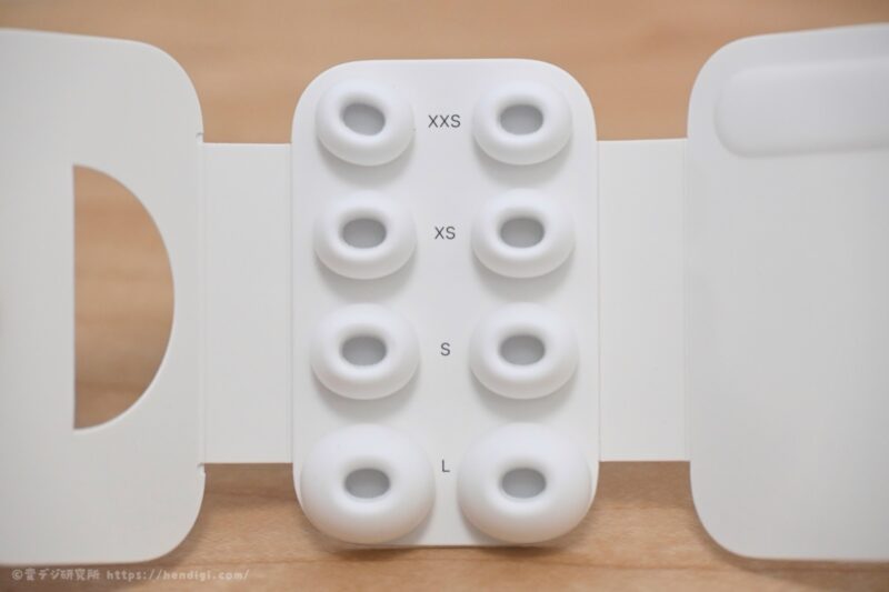 次にイヤーピースですが、デフォルトで装着されているMサイズを含め、XXSからLまで5種類が付属しています。最初から5種類もあれば最適なサイズが選びやすくていいですね。