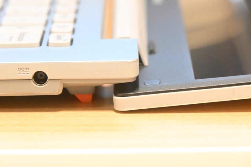 背面にはオレンジ色の滑り止めが配置されていて、見た目のアクセントにもなっています。排熱用のスリットも多く、エントリーモデルながら放熱効果をしっかりと考えられたデザインに仕上がっています。ただ、ファンは1基のみで、このあたりは価格帯なりの構成だと思いました。
