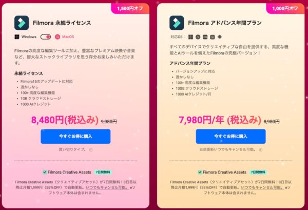 Filmoraには買い切りの「永続ライセンス」と、サブスクタイプの「アドバンス年間プラン」が用意されていて、自分は「アドバンス年間プラン」を選びました。今だと1000円オフの7,980円(年額)になっていました。