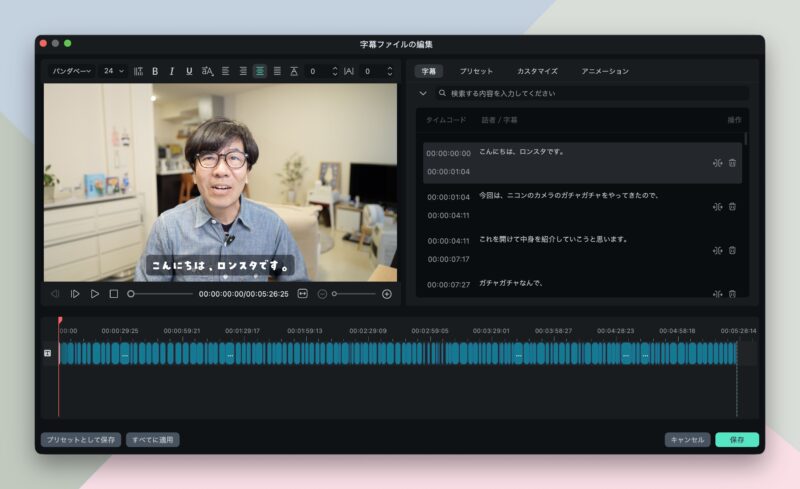 字幕の表示スタイルや、フォントなどもこの画面で完結できるのは便利です。編集にかかる時間も手動でフルテロップにすると思ったら、半分以下、いや3分の1くらいに短縮できます。もちろん滑舌がよかったり、専門用語が少なめだったら、もっと速いと思います。