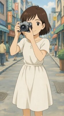 「この子が街で写真を撮っているシーン」と入れただけだと、カメラが2台になったりしたので「カメラは1台」と追記しました。最初のイラストより子供っぽくなったり、AIなので完璧ではありませんが、なんとなくイメージしていたイラストが完成しました。