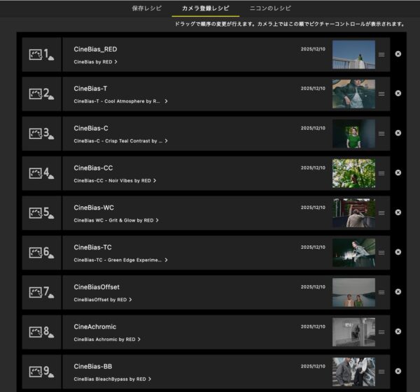 ニコンのイメージングレシピは、スマホやブラウザから「Nikon Imaging Cloud」にアクセスして、好きなレシピを保存、その後カメラに登録します。Nikon Z50IIの場合は、全部で9つのレシピを登録できるので、今回はRED監修のレシピを全て登録しました。