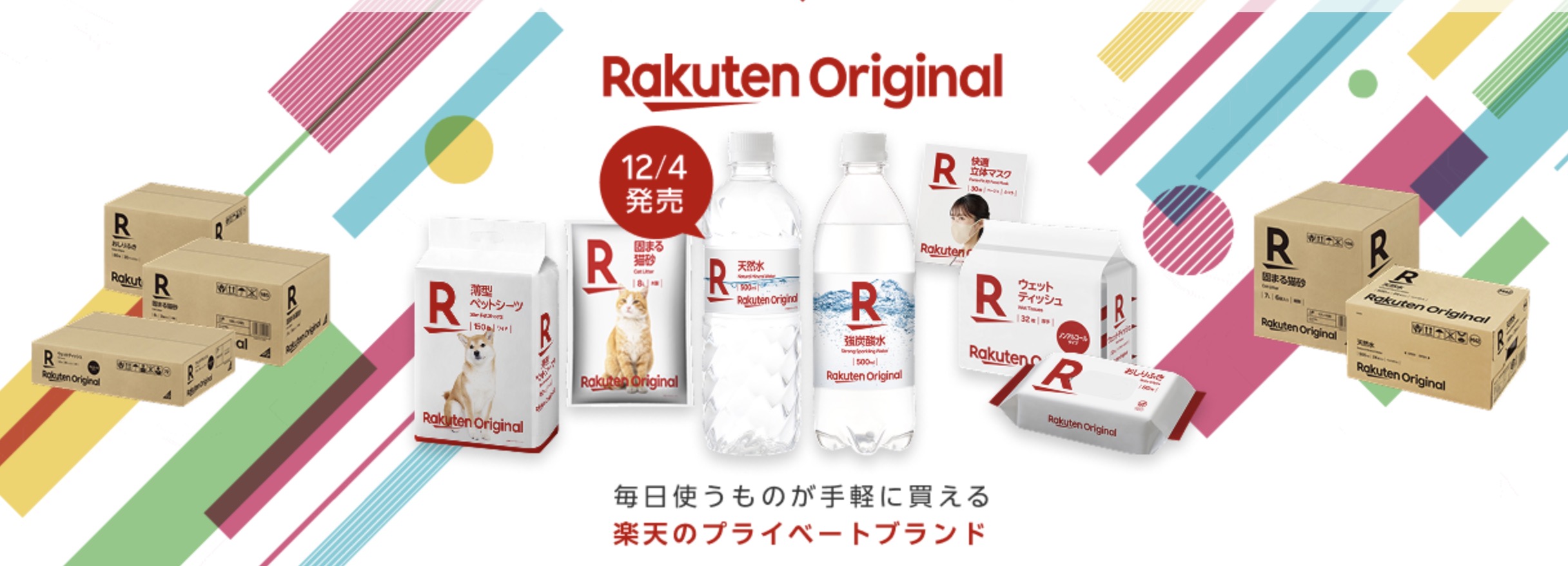 楽天市場が、初のプライベートブランド「Rakuten Original」をスタートしました。現在は天然水、炭酸水、ウェットティッシュ、マスクなどの日用品がラインナップされていますが、今後、ペットシーツや猫砂など、様々な商品が発売されるようです。